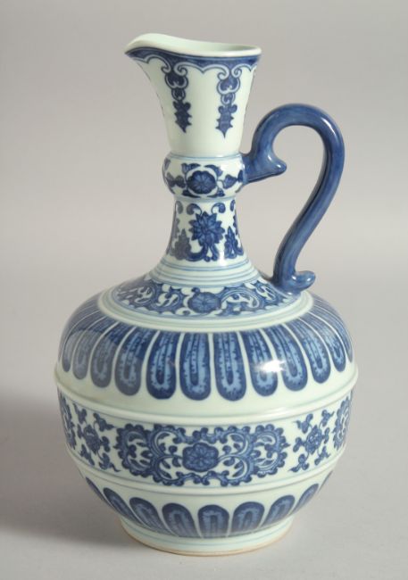 A CHINESE BLUE AND WHITE PORCELAIN EWER, with floral motifs, the base with character mark, 21cm high.