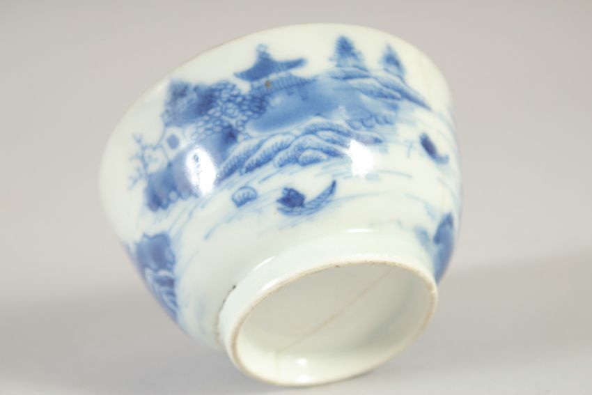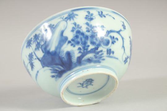 A CHINESE KANGXI BLUE AND WHITE BOWL, together with a blue and white plate and cup (cup repaired), bowl 14.5cm diameter, plate 23cm, cup 8cm diameter, (3).