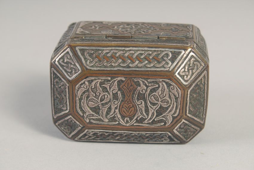 A SYRIAN MINIATURE BRASS BOX, with hinged lid, 7cm x 4.5cm.