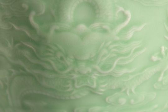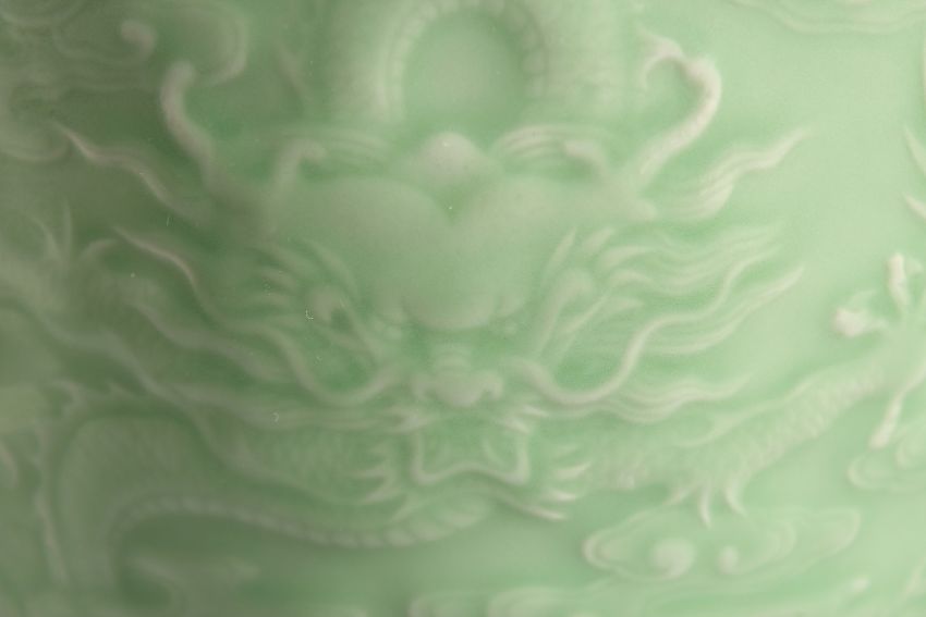 A RARE CHINESE CELADON GLAZE CARVED DRAGON VASE, the relief decoration with dragons surrounding the flaming pearl of wisdom amongst stylised clouds, the base with six-character mark, 30cm high.