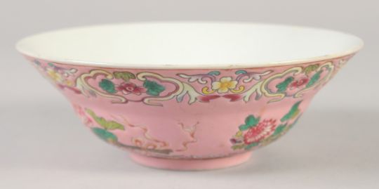 A CHINESE FAMILLE ROSE PORCELAIN BOWL, decorated with flora, the interior with five bats, four-character mark to base, 17cm diameter.