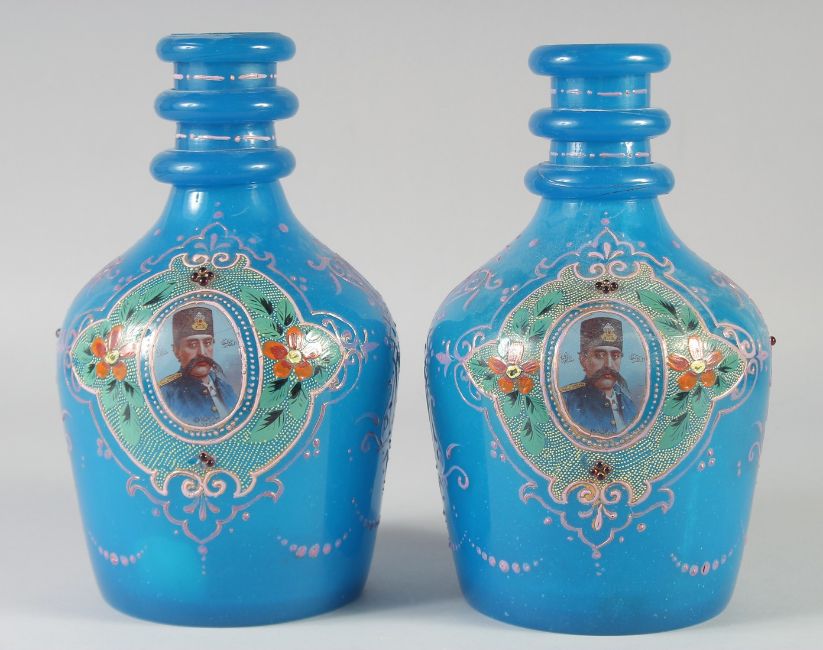 A SUPERB PAIR OF BOHEMIAN GLASS ENAMELLED BOTTLES, with portrait of Muzaffar Aldin Shah, 26cm high.