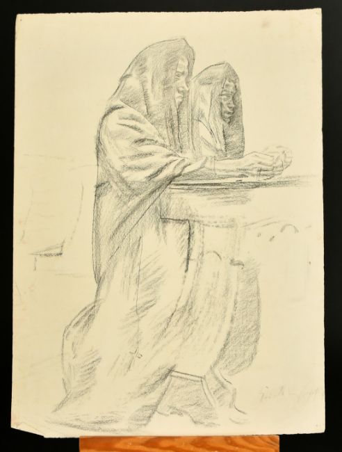 Erich Wolfsfeld (1884-1956) German, Two women at prayer, charcoal, signed, paper size 18.75" x 13.75", (48x35cm) (unframed).