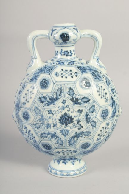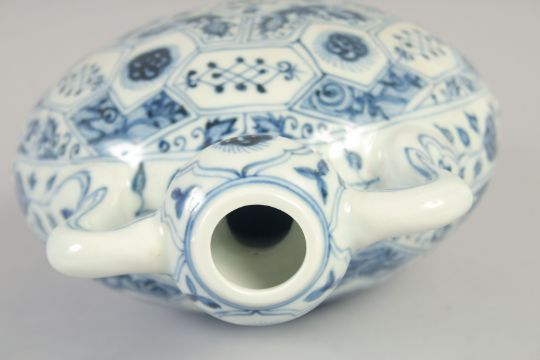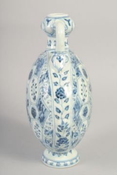 A CHINESE BLUE AND WHITE PORCELAIN TWIN HANDLE MOON FLASK, with floral motifs, 28cm high.