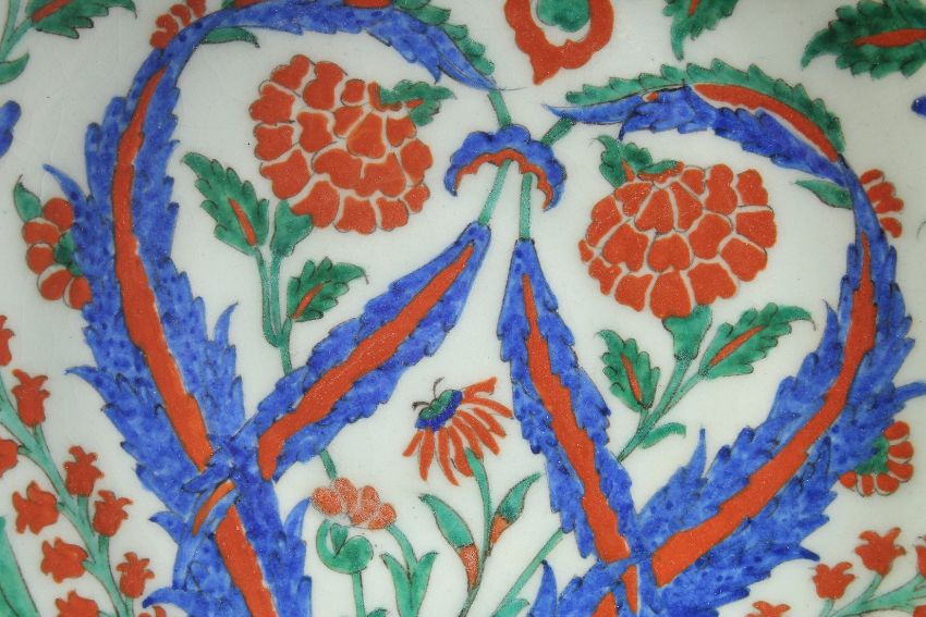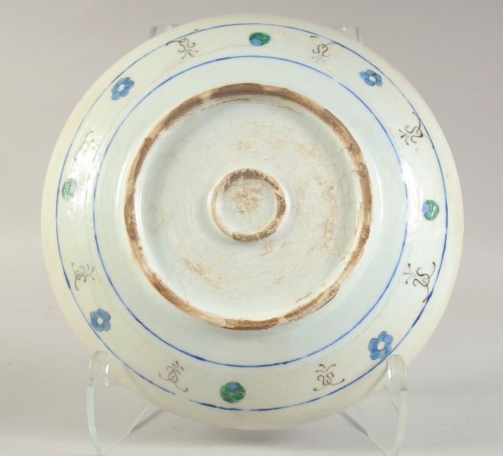 A TURKISH OTTOMAN GLAZED POTTERY PLATE, painted with sprays of flora, 31.5cm diameter.