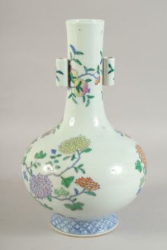 A CHINESE DOUCAI DECORATED PORCELAIN POMEGRANATE VASE, decorated with chrysanthemum and fruits with twin cylindrical handles, (neck repair), the underside with a six-character mark, 34cm high, (af).