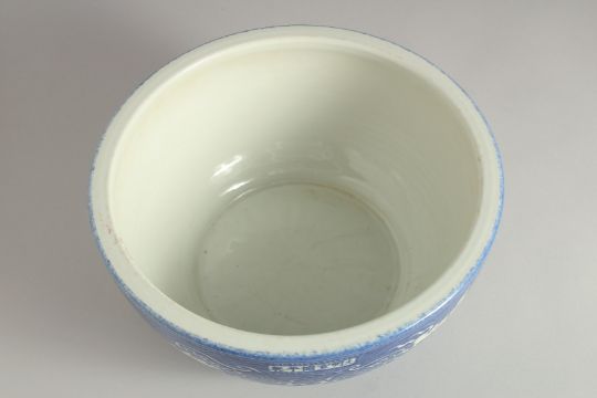 A CHINESE BLUE AND WHITE PORCELAIN SEA WATER DRAGON BOWL, the exterior with incised white dragons on stylised waves, bearing six-character mark.