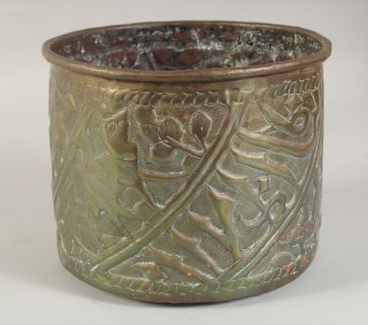 AN ISLAMIC EMBOSSED BRASS BOWL, with animals and calligraphy, 20cm diameter.