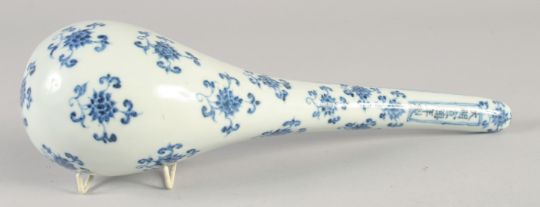A LARGE CHINESE BLUE AND WHITE PORCELAIN LADLE, the interior with characters, bearing six-character mark, 34cm long.