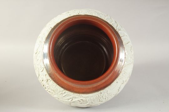 A CHINESE CARVED DRAGON JAR, character mark to base, 25cm diameter.