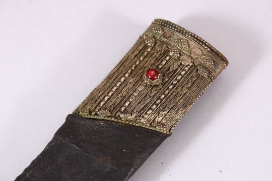 A 19TH CENTURY ISLAMIC ARABIC JAMBIYA DAGGER, with inset stones with a white metal and leather sheath, 47cm