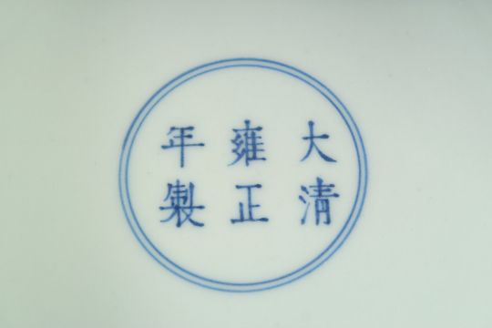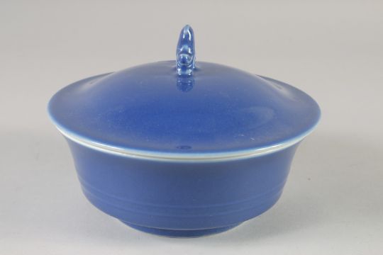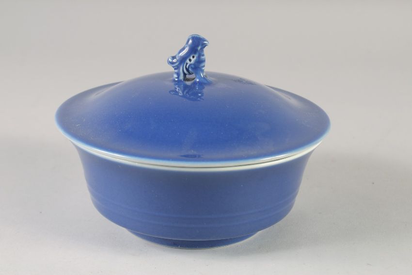 A CHINESE POWDER BLUE GLAZE BOWL AND COVER, the cover with moulded bird finial, bearing Yongxheng mark, 17cm diameter.