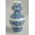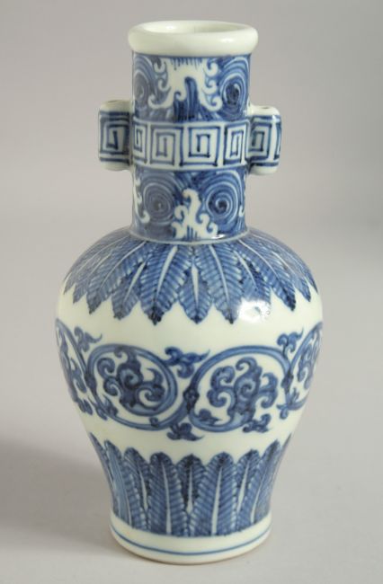 A CHINESE BLUE AND WHITE TWIN HANDLE VASE, six-character mark to base, 19cm high.