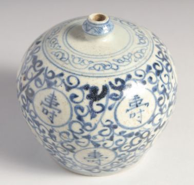 A SMALL CHINESE BLUE AND WHITE PORCELAIN BULBOUS VASE, painted with characters, 11.5cm high.