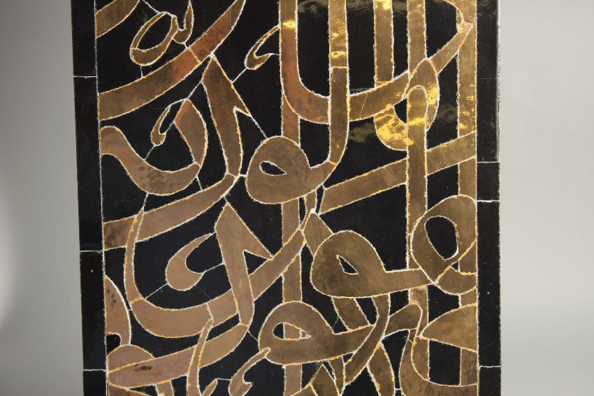 A CONTEMPORARY GILDED CALLIGRAPHIC MOSAIC TILE, 64.5cm x 34.5cm