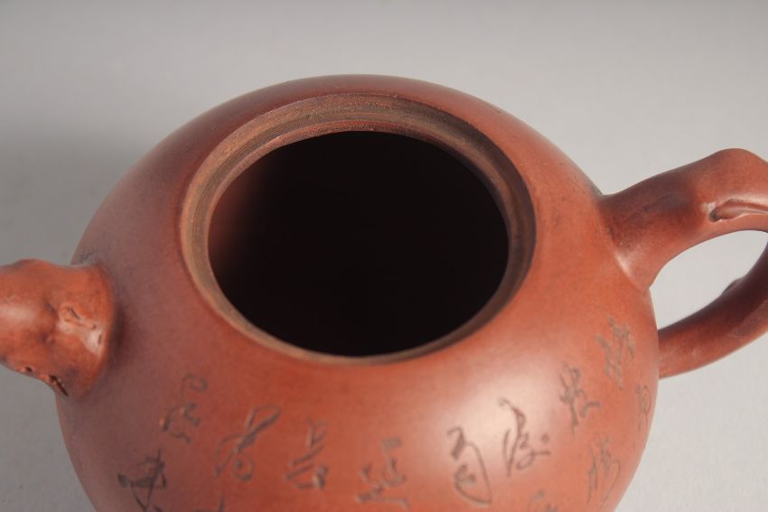 A CHINESE YIXING TEAPOT signed by Gu Jing Zhou, 16cm spout to handle.