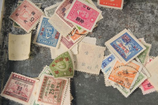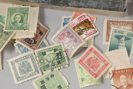A BOX OF OLD CHINESE STAMPS.