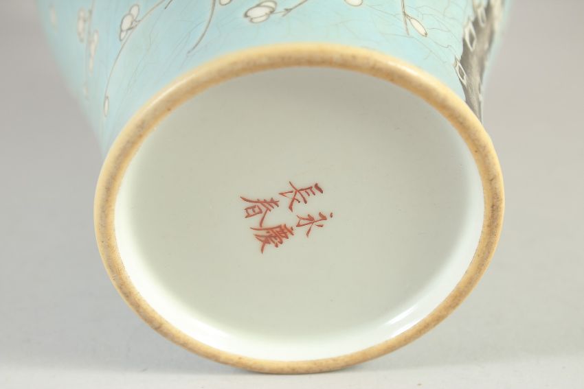 A CHINESE BLUE GROUND PORCELAIN TWIN HANDLE VASE, decorated with birds on a branch, four-character mark to base, 34cm high.