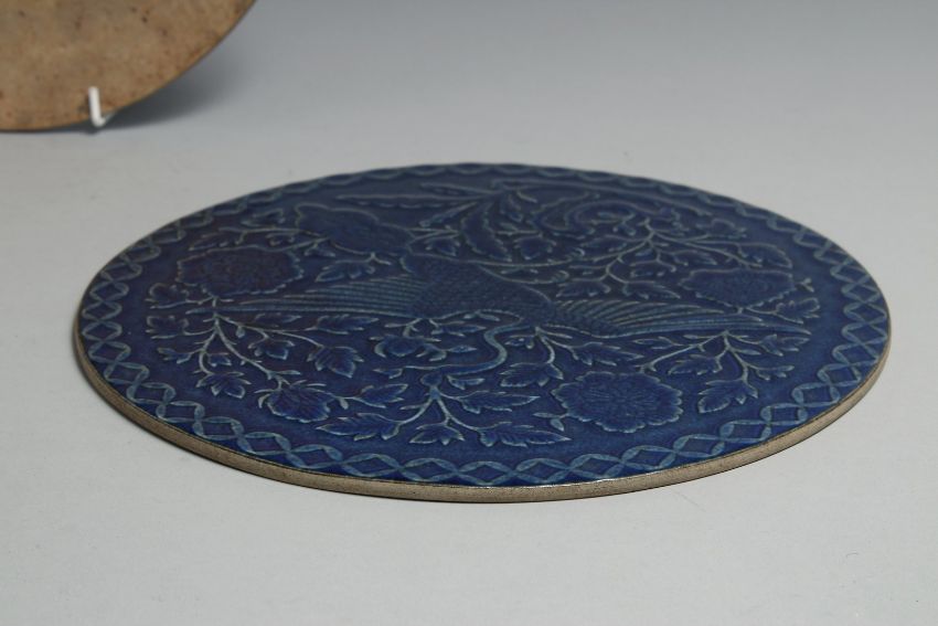 A PAIR OF CHINESE BLUE GLAZED CIRCULAR PLAQUES, one carved with a dragon, the other with an exotic bird, 28cm diameter.