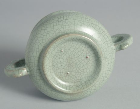 A CHINESE CELADON TWIN HANDLE CENSER, 15cm wide (handle to handle).