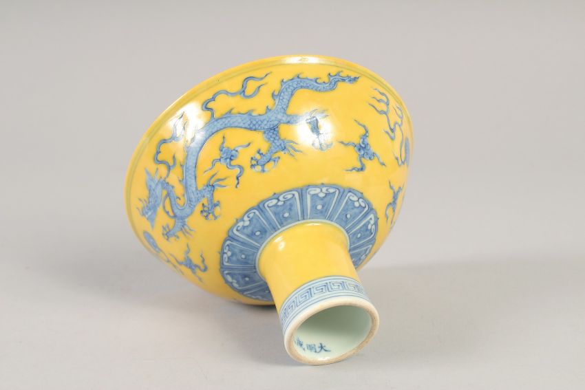 A CHINESE YELLOW GROUND BLUE AND WHITE STEM CUP, decorated with dragons, with six-character mark, bowl 15cm diameter.