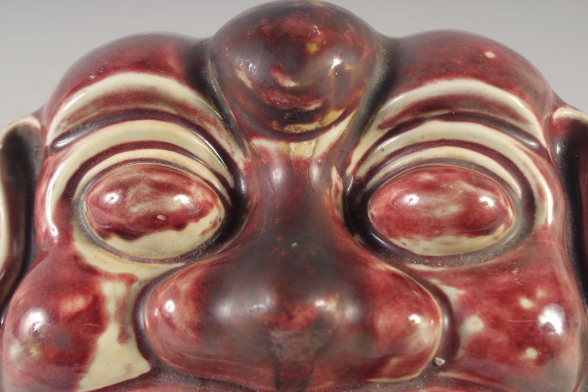 A CHINESE COPPER RED GLAZED POTTERY LION DOG MASK / WALL HANGING, 21cm wide.