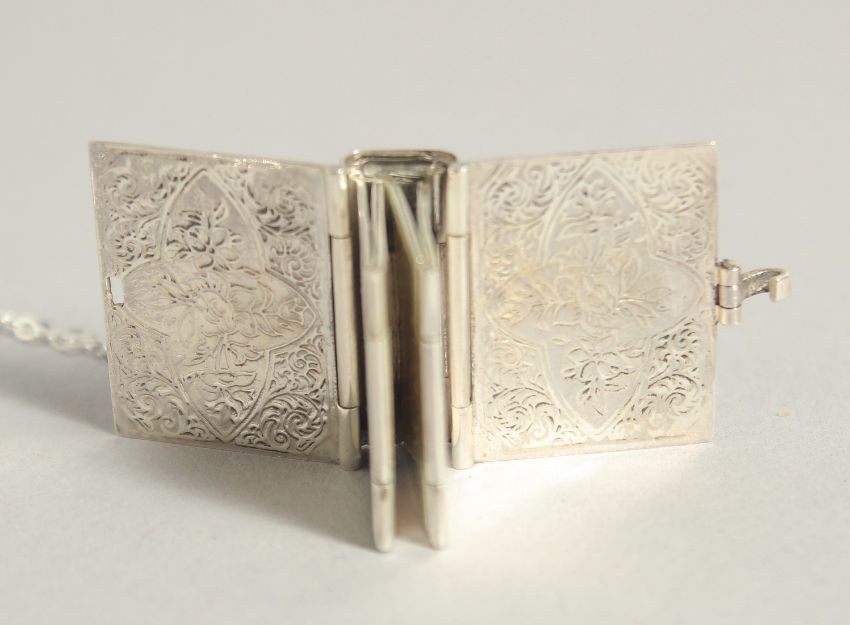 A SILVER BOX LOCKET ON A CHAIN.