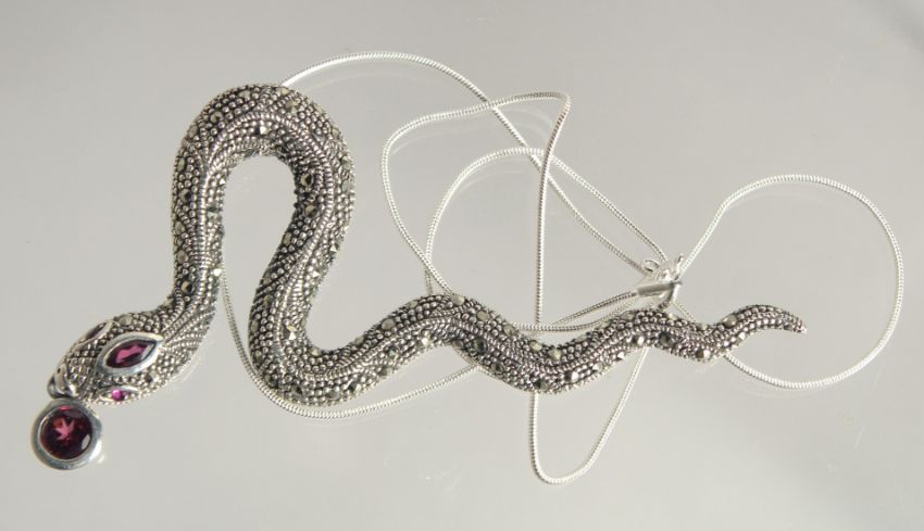 A SILVER MARCASITE AND GARNET SNAKE NECKLACE.