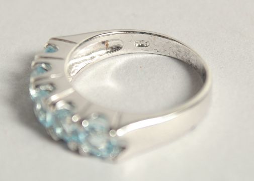 A SILVER BLUE TOPAZ HALF ETERNITY RING.