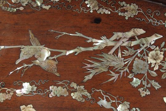 A CHINESE MOTHER OF PEARL INLAID HARDWOOD OVAL-FORM TRAY, finely decorated with various birds and native flora, 63.5cm x 41.5cm.