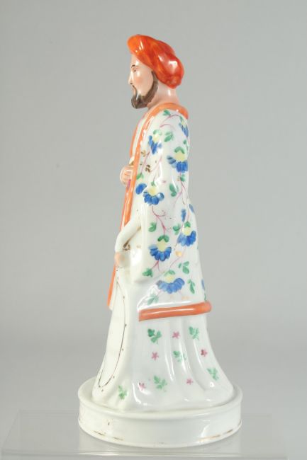 A 19TH CENTURY EUROPEAN PORCELAIN FIGURE OF AN OTTOMAN SULTAN, 29cm high.