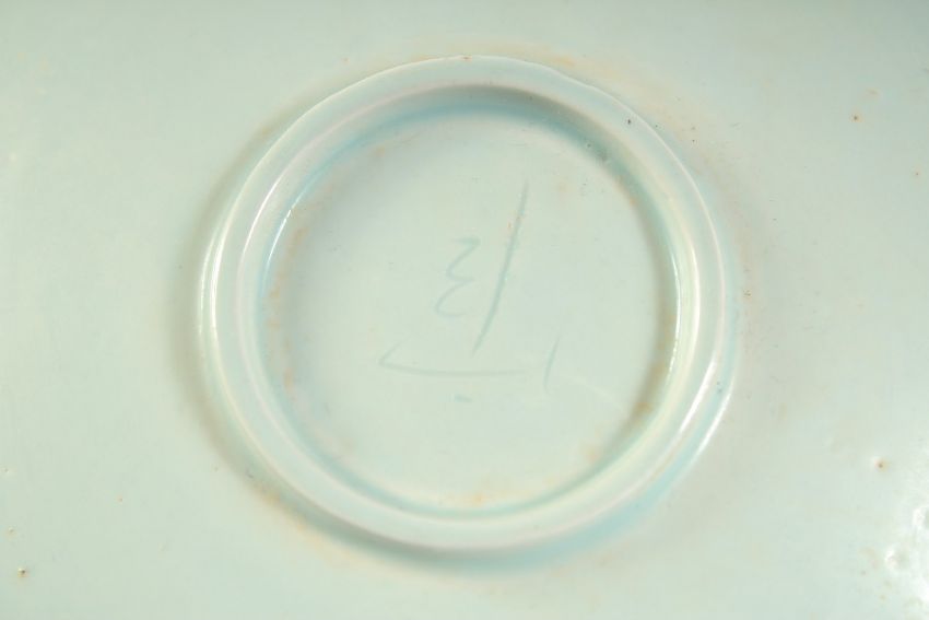 A CHINESE CARVED PEACOCK YINQING GLAZE DISH, 20.5cm diameter.