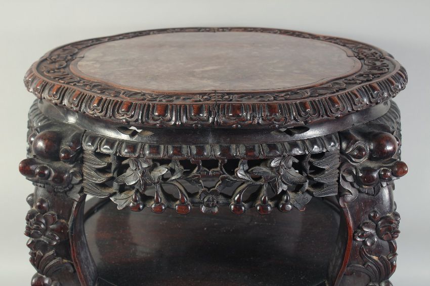 A LARGE 19TH CENTURY CHINESE MARBLE INSET CARVED HARDWOOD VASE STAND, with carved and pierced foliate frieze on four similarly carved curving legs terminating in claw feet; united by a circular hardwood under-tier, 57.5cm high, surface 56cm, (66cm at widest point).