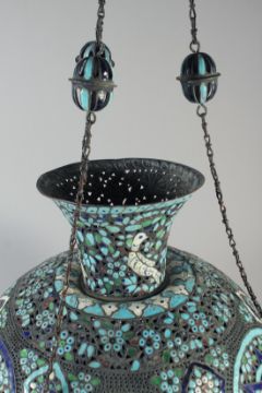 A 19TH CENTURY ISLAMIC ENAMELLED OPENWORK MOSQUE CHANDELIER, with hanging chains, 49cm diameter.