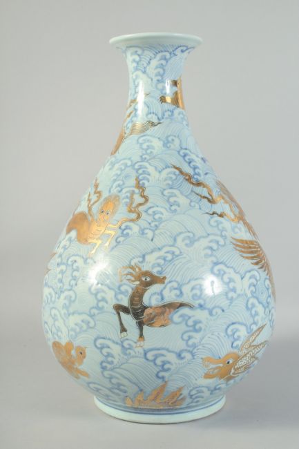 A LARGE CHINESE BLUE AND WHITE OCEAN WAVE YUHUCHUNPIN VASE, decorated with gilt dragon and mythical beasts, 46cm high.