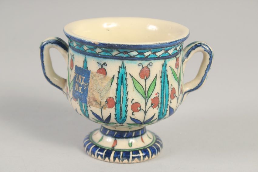 A 19TH CENTURY IZNIK STYLE TWIN HANDLE CUP, 9.5cm high.