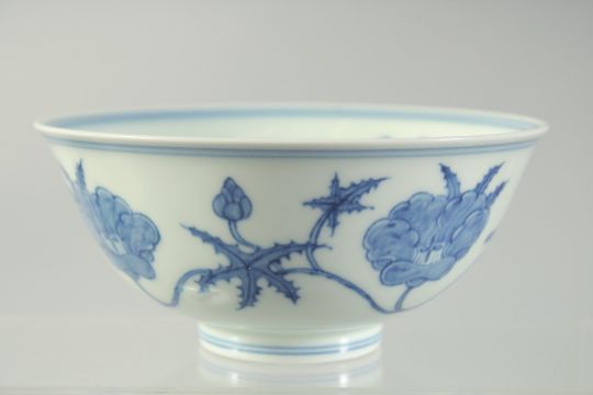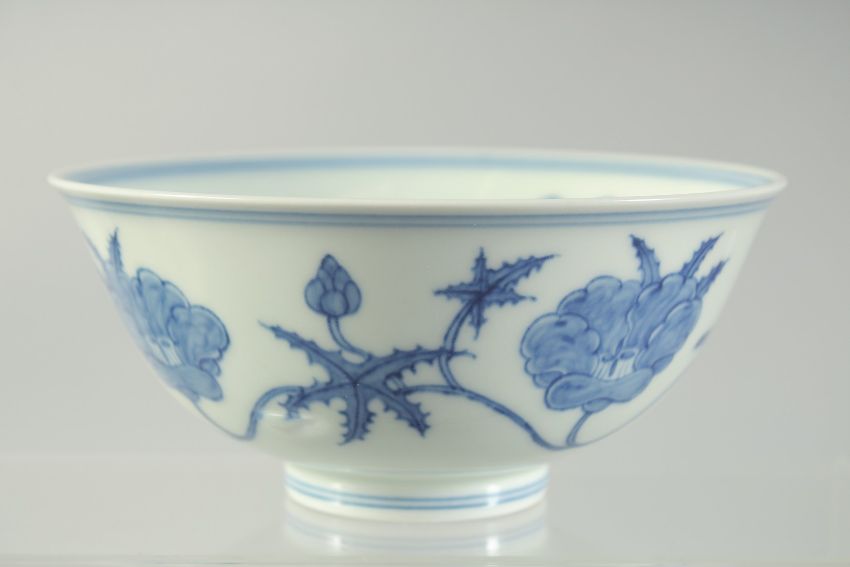 A CHINESE BLUE AND WHITE PORCELAIN BOWL, painted with flower heads, six-character mark to base, 15cm diameter.