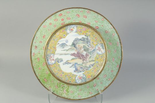 A FINE RARE QING DYNASTY YELLOW GROUND CLOISONNE ENAMEL CHARGER, decorated with a central panel depicting a scene of European figures with further panels of birds and flora, the base finely painted with a landscape scene including a blue character mark, 40.5cm diameter.