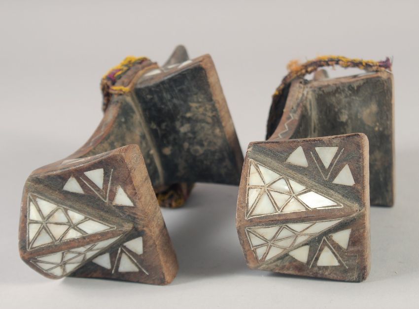 A PAIR OF OTTOMAN MOTHER OF PEARL INLAID WOODEN CLOGS.