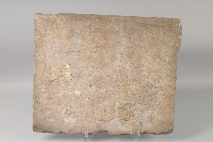A FINE 17TH CENTURY MUGHAL NORTH INDIAN CARVED STONE PANEL, depicting a lotus flower, 48.5cm x 58cm.