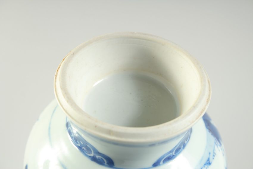 A CHINESE TRANSITIONAL BLUE AND WHITE PORCELAIN VASE, painted with flora, (neck cut with silver rim cap), 18cm high.