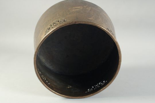 A MAMLUK REVIVAL BRASS OPENWORKED JARDINIERE, with engraved panels of calligraphy and decorative motifs, 23cm high.