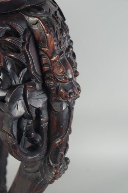 A CHINESE MARBLE INSET CARVED HARDWOOD VASE STAND, with petal-shape top, carved and pierced foliate frieze on four similarly carved curving legs and uniting floral stretcher, 62cm high, top 31cm wide, 41cm at widest point.