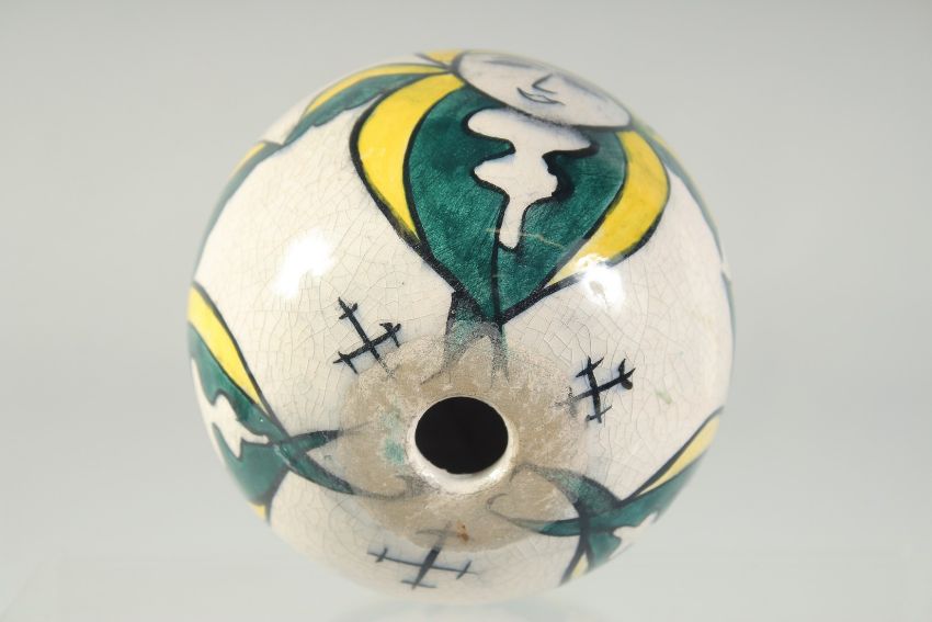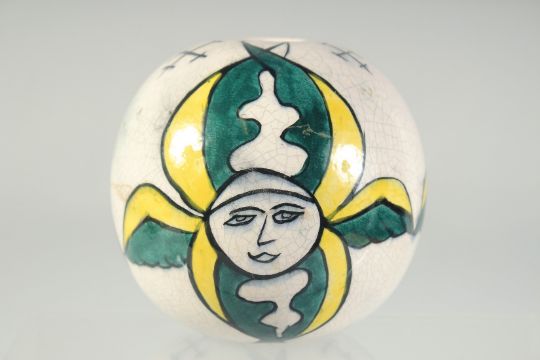 A TURKISH KUTAYHA GLAZED POTTERY HANGING BALL ORNAMENT, 11cm.