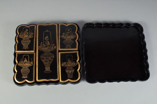 A FINE BLACK AND GILT LACQUER LIDDED BOX, containing five fitted smaller lidded boxes, each painted with vases of flowers, 26.5cm x 25.5cm.