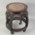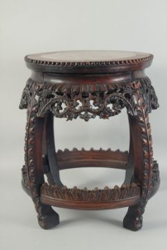 A CHINESE MARBLE INSET CARVED HARDWOOD BARREL-FORM VASE STAND, with carved and pierced foliate skirt on four curving stretchered legs, 47cm high, top 36cm diameter, 38.5cm wide, 42cm at widest point.