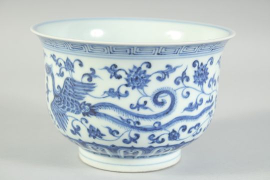 A CHINESE BLUE AND WHITE PORCELAIN BOWL, with phoenix and lotus decoration, the base with six-character mark, 15.5cm diameter.