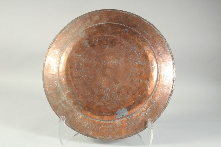 AN ENGRAVED COPPER DISH, 34cm diameter.