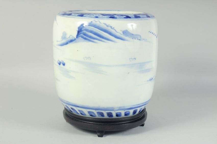 A CHINESE BLUE AND WHITE PORCELAIN JARDINIERE, on a fitted hardwood stand, 28.5cm high overall.