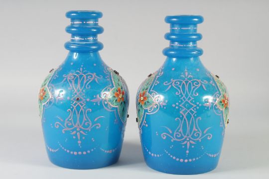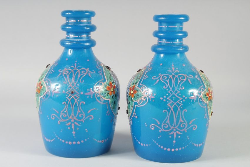 A SUPERB PAIR OF BOHEMIAN GLASS ENAMELLED BOTTLES, with portrait of Muzaffar Aldin Shah, 26cm high.